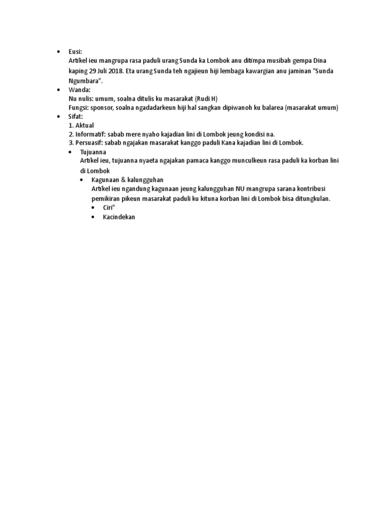 Dalam situs atau blog basasunda.com ini sendiri, sebenarnya sudah saya tuliskan beberapa contoh artikel dalam bentuk bahasa sunda sebelumnya. Dahar isuk kadang mah sok diliwatkeun ku loba jalma kalawan sagala rupa macem alesana, misalna bae ku sabab teu kaburu mangkat ka sakola, buburu gawe, jeung lain sajabana.aya ogé nu alesan tara biasa dahar ti isuk ceunah. Gambar terkait model undangan tahlil bahasa. Contoh artikel bahasa sunda tentang pendidikan pendidikan mangrupakeun kabutuhan penting pikeun nunjang kahirupan urang. Contoh artikel karangan persuasi tema kesehatan bahasa sunda (3 paragraf) judul :